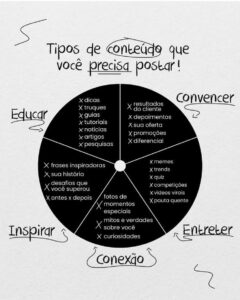 Temos duas imagens que você acabou de ver ilustram perfeitamente esse processo: de um lado, o equilíbrio entre seu negócio e seu público; do outro, os principais tipos de conteúdo que sua marca precisa trabalhar para gerar conexão, autoridade e resultados.